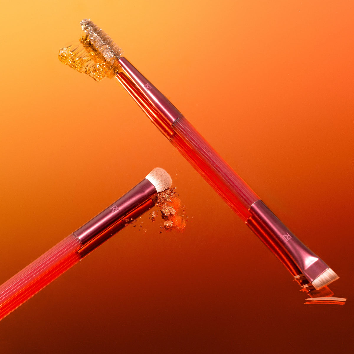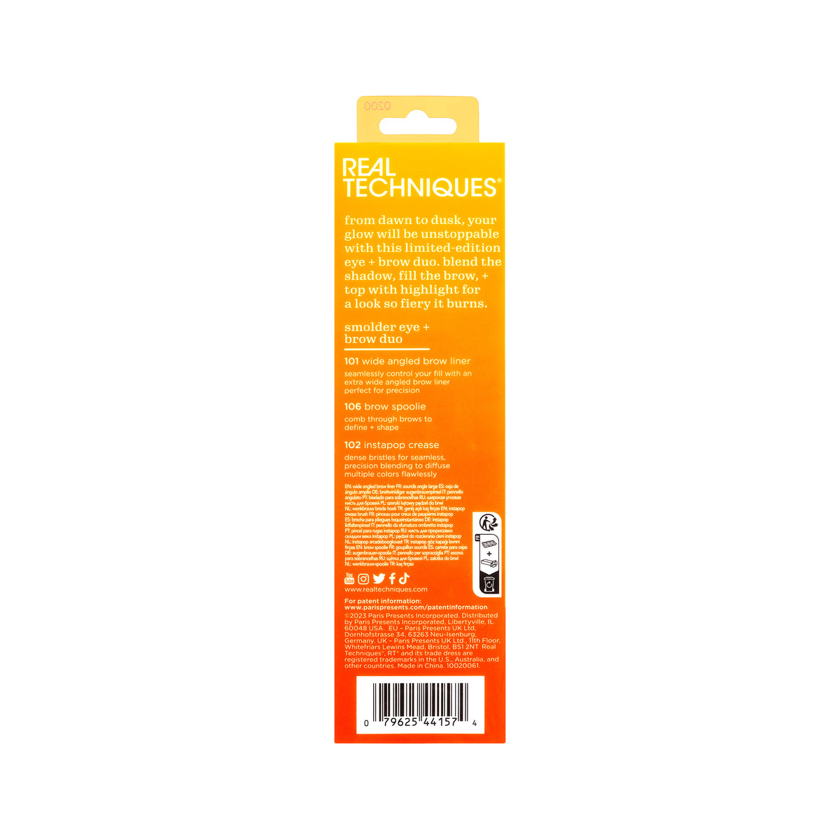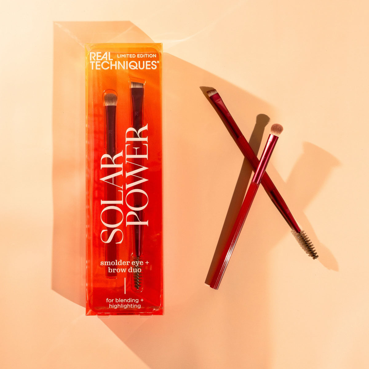 The Real Techniques Solar Power Smolder Eye + Brow Duo helps you blend shadow, fill your brows, and top with highlight for a look so fiery it burns. The makeup brush duo includes the dual-ended 101 Wide Angled Brow Liner Brush and 106 Brow Spoolie, as well as the 102 Instapop Crease Brush. These eyebrow and eyeshadow brushes can be used with liquid, cream, and powder products. From dawn to dusk, your glow will be unstoppable with the limited-edition Solar Power collection. The Smolder Eye + Brow Duo is easy to clean using our Real Techniques Brush + Sponge Cleansing Gel. It’s also 100% cruelty-free and made with UltraPlush, synthetic bristles.